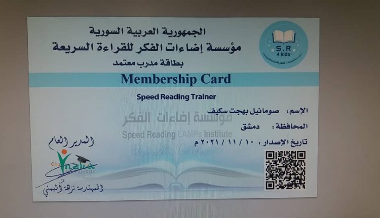 بطاقات المدربين المعتمدين لمؤسسة إضاءات الفكر للقراءة السريعةمدربين دمشق