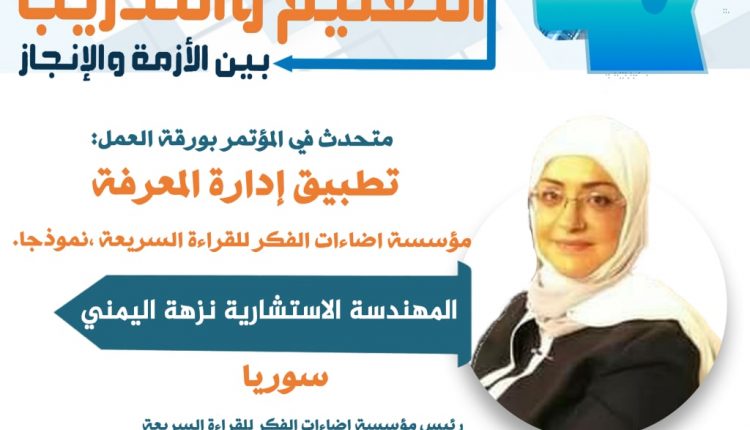 إن الإدارة الناجحة للمعرفة هي التي تستخدم المعرفة المتوافرة في الوقت المناسب، ودون أن تفقد استثمار فرصة توافرها لتحقيق ميزة لها أو لحل مشكلة قائمة. ولتطبيق المعرفة أساليب وتقنيات تشرحها الباحثة المهندسة الاستشارية نزهة اليمني من سوريا في ورقة عمل قدمتها ضمن فعاليات المؤتمر العربي الأول “التعليم والتدريب بين الأزمة والإنجاز” بعنوان “تطبيق إدارة المعرفة”. والجدير بالذكر أن الباحثة هي رئيس مؤسسة إضاءات الفكر للقراءة السريعة، ومؤسس البرنامج في سوريا، وحاصل على المواصفة 10015 ISO من المنظمة الأوروبية لإدارة الجودة وهي مدقق تدريب للمؤسسات والحقائب التدريبية بترخيص من المنظمة الأوروبية للجودة.