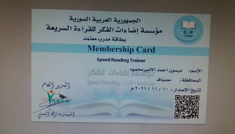 بطاقات المدربين المعتمدين لمؤسسة إضاءات الفكر للقراءة السريعةمدربين مصياف