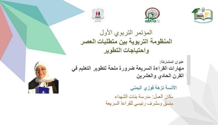 نتشرف بالمشاركة في المؤتمر التربوي الاول لجامعات حماه بعنوان #القراءةالسريعة_ضرورة_ملحة_لتطويرالتعليم_في_القرن21) معي :